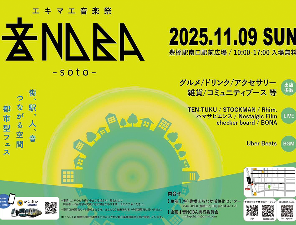昨年大好評のうちに幕を閉じたイベントが都市型フェスとして帰ってきます! 選りすぐりのアーティストによるステージライブに加え東三河のグルメ、 雑貨や東三河各地で人気のコミュニティのブースなどが集結します。話題の人、モノ、コトをチェックしてください! 『音NOBA−soto-』 2025年11月9日10:00-17:00豊橋駅南口駅前広場入場無料!